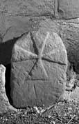 Round-topped headstone. In the upper part of the stone the background is cut back to leave a low relief, equal-armed cross with wedge-shaped arms (type B6). The other faces are plain.
