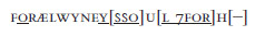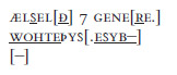 The texts read together as: ǢLSEL[Ð] 7 GENE[RE.] WOHTE þYS[.E] [SYB–] FOR ǢLWYNEY[S] [SO]U[L] [7] [FOR] H[–] (Ills. 134, 135). Earlier drawings and photographs suggest that the text can be reconstructed as: ǢLSEL[Ð] 7 GENE[REÐ] [WROHTE] þYS[NE] [SYBSTEL] for ǢLWYNEY[S] [SO]UL 7 [FOR] HEY[SEL], 'Aelsel[ð] and Gene[reð] made this ?family-stone [or ?place of peace] for Aelwine's soul and for ?themselves [or ?Hey[sel]]'. The language seems to be early Middle English, possibly of the late eleventh or twelfth century, and the names are all of English origin. For a fuller linguistic discussion see Okasha 1993, 144–5.