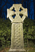 A (broad): On the head, an incised edge-moulding runs all the way around the edge of the arms. At the centre is a small boss surrounded by a concentric moulding. At the end of each cross-arm, except the top (which is worn flat), are two parallel flat bands; in the bottom cross-arm there are also very worn traces of a triquetra knot, but similar ones cannot really be made out in any of the other arms because they are so worn. The ring has a central incised line, dividing it into two bands, which follow the line of the two bands at the end of each cross-arm. Within the prominent flat edge-moulding on the shaft, the decoration is in low relief, and comprises linked Carrick Bends (simple pattern F). These are worked in thick flat bands, with two median-incised lines to give the impression of three strands.