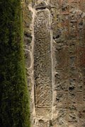 Only the shaft survives. This may be nearly the full original length although some may be missing at the top since the break is oblique and the pattern at this end incomplete. The top 30 cm of the shaft tapers noticeably inward towards the broken end. At the opposite end, the bottom 22 cm of the shaft is undecorated and represents the tenon which would have been morticed into a base. It is not certain whether the one visible face is front/back or side of the monument. Investigation has indicated that decoration survives on all the hidden sides of the shaft, and that all angles have an incised edge-moulding (Preston-Jones 2009, 18).