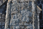 A (broad): Linked single-strand triquetras or Stafford knots (simple pattern E) fill the cross-arms. In the centre of the cross-head is a small flat boss with a shallow hole in the centre. The decoration on the shaft is in three panels, without any moulding or line between them. The top panel contains the inscription, incised in three horizontal lines. The text is probably incomplete at the beginning where part of the shaft is lost. The letters are 4 to 8 cm in height, are rather deteriorated and are predominantly insular in form. The text reads: