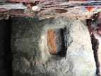 Undecorated cross-base of roughly rectangular form, with a mortice which is rectangular but with rounded corners and slightly tapering sides. The base has been trimmed along one edge to make it fit its present location, so would have been slightly larger originally; the mortice is asymmetrically positioned in the base.