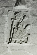 A (broad): The panel is flat, and a fragment of slightly raised undecorated surface in its upper left corner, defined by a shallowly curving edge, perhaps indicates the edge of a significant element of the original design in that direction. The sculpture has been created by removing the stone surface to form a figure in considerable relief; the tooling marks from this process are everywhere visible on the reserved surface. There are no residual traces of painting. The seated male figure is carved in two distinctive ways: the head and distinguishing appurtenances are carved boldly in the round, whereas the torso and lower body, with the garments, are defined in minimum relief with detailing picked out by incised lines.