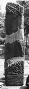 The left-hand side of the text is worn and much less clear than the right. It is also more compressed: the runes are just under 7 cm (2.8 in) high. Traces of some nine upright staves remain, representing perhaps eight or nine runes. None of these can be identified with certainty, though the indications are just about enough to confirm that this part of the text runs upwards from the bottom of the panel, with the bases of the runes also towards the middle of the stone, and thus upside-down with respect to the other line. The first discernible character has a bow to the right of the stave and may well be ‘þ’, less probably ‘r’ or ‘u’. The next might be ‘æ’, though the arms are faint: Elliott (1964, 214) read ‘b’. Alternatively, if the lower arm is illusory, it is possible that the upper is connected to the following stave, turning the whole complex into ‘e’. If there is no connection here, the second stave is probably an ‘i’ since there is no sign of incision to its right: this is what Elliott read. There are marks, but rather indistinct ones, to right of the next stave: they seem to me to suggest ‘o’, though Elliott again saw ‘b’. The next rune, in some lights, looks clearly like ‘r’, though Elliott read ‘æ’. There are then three or four more staves before the broken edge of the stone. The first could again be ‘i’, though it is very worn at the top where something may well be lost. In some lights the last complex looks like a pair of staves joined by cross-arms from top to bottom, producing ‘d’.