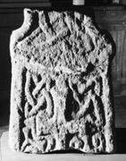 A (broad): The shaft is decorated with a panel containing the upper and horizontal arms of a cross in the centre, with the lower arm truncated; the others have wedge-shaped terminals (type B6: Cramp 1991, fig. 2). The centre may have been decorated by a raised motif, but this is now too worn to decipher clearly. On either side of the upper arm are closed-circuit patterns comprising two inter-linked loops; neither is symmetrical and both are of different widths. Below each of the horizontal arms are further patterns. However, only the tops are visible and it is not now possible to decipher their form.