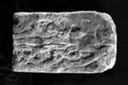 E (top): The top of the stone preserves carved decoration in the form of a series of curling strands set on either side of a thin rounded vertical moulding that traverses the face; the width of this is not regular but rather, undulates along its length. The surface of the carving is badly damaged and broken in places, particularly on the left, but the strands seem to have been marked by a central incision and curled at the terminals or where they intersect with each other. The right-hand edge may have been bounded by a thin rounded edge moulding.
