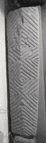 Grave-cover, tapering in width and thickness towards the foot-end. Decorated with a pattern of chevrons set to either side of a conjoined pair of sub-rectangular ‘squares’ each outlined by four grooves which continue up and down the slab as simple chevrons.