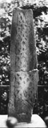 B (narrow): This face is decorated with a simple three-strand interlace which tapers towards the top and is somewhat irregular. The bottom of the interlace is damaged where the stone has been dressed-off. Flat-band edge mouldings are visible on each side.