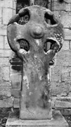 B (narrow): This face is decorated on the shaft by a panel containing what may be a half-pattern interlace although it is now badly weathered and difficult to discern. The panel is contained between two mouldings, outside of which are edge mouldings; that on the left appears to be cable moulded. Any decoration on the cross-head has now worn away except for chevron markings on the lower part of the head. There appears to be a badly-worn thin edge moulding around the cross-head.