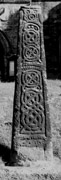 B (narrow): This face contains three panels of carved decoration. The lowermost panel is filled with an irregular interlace which terminates at the bottom in V-shaped loops in the form of a Stafford Knot. The two strands from the bottom loops extend upwards and entwine as an irregular spiralling interlace which terminates as a double semi-arcaded moulding. The middle panel is articulated as a round-headed panel formed by a continuous flat moulding set within the outer edge mouldings; this contains a simple two-strand plait and the arcading above is formed from five thin strands extending from the edge mouldings. In the centre of the fourth strand is a small circular motif with an incomplete outer ring. The uppermost panel contains three irregular motifs. The lowermost is a closed-circuit triple inverted V-looped triquetra design incorporating a small pellet within a loop and a detached inverted V framing a further pellet within its apex. Above this are two irregular motifs, the lower comprising a closed loop with a strand extending upwards, and the other a closed irregular looped motif. The two upper motifs may be joined together by a snaking strand but this is unclear.