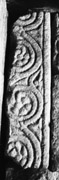 B (narrow): Almost two-thirds of this face is obscured by the adjacent stone built into the porch display. The portion that is visible is badly damaged. One curved strand can be discerned and a small interlacing at the top with a strand crossing it diagonally at the bottom left; the central ornamentation is damaged and missing. It is not clear whether the scheme formed a simple interlace pattern or a plant-scroll, as on A.