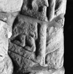 A (broad): The inner roll moulding extends at an angle across to the left of the stone to form a triangular-shaped frame containing the lower portions of a profile figure whose feet, turned to the left, and legs emerge from the hemline of a robe that droops sharply at each corner.