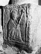 A (broad): The carving on the right is lost in damage to the stone, and that to the left is badly worn. Originally centrally placed, are the remains of a haloed, veiled forward-facing figure. The face was well modelled and oval-shaped, with a fold of drapery continuing round the left of the face, over the shoulder and across the chest; the outlines of an eye, the nose and chin are still visible under the damage. The outline of the left-hand side of the torso indicates that the arm was bent across the body. The clothing was formed by a series of regular neat parallel ribbed folds crossing the body diagonally from the shoulder. The area to the left of the figure is filled with a series of horizontal parallel plain flat mouldings above which are two short horizontal rectangles from which emerge two curved oval terminals. Below the horizontal mouldings is a vertical feature, lightly incised with vertical parallel lines, which curves to the left. In the space between this and the inner roll moulding is an indistinguishable feature with a bulbous shape under the curve set over an irregular vertical feature.