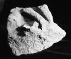 A (broad): The remains of two intersecting sections of roll moulding survive, the lower one of which contains the remains of the head of a human figure with short hair and deeply drilled eyes. To the right are the remnants of the terminal of a floriated rod.
