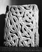 B (narrow): This face has a simple two-stranded interlace pattern, the strands of which pass through what appears to be closed-circuit ‘figure-of-eight’ loops that touch each other (simple pattern F: Cramp 1991, fig. 23), although only two such patterns are visible and both are incomplete. The strands may have been median-incised, like those on A, but the surface is damaged by tool marks probably made when the stone was reused as building fabric.