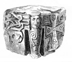 A: The illustration shows a form of triquetra design with two strands of interlace passing through it, below which is an area which appears to have been worn away so that its decoration is indistinct. To the right, on the corner of the impost, is an area deeply carved away around a tapered, round, column head which appears to have been quite narrow (possibly only c. 7 cm (2.75 in) in diameter) if Cox’s description of its measurements is correct. The column head is decorated with some form of narrow-stranded interlace (unclear) with a human head above it, reaching to the top of the impost.