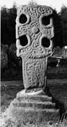A (west, broad): At the centre of the head is a flat boss carrying an incised linear equal-armed cross; this is surrounded by a mixture of spiral-scroll and stopped-plait ornament. Similar ornament, with pellets, decorates the shaft panel, occasionally over-riding the inner cabled border.