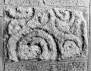 No information is available about faces other than the one now visible. To the right is a roll-moulded border flanking spiral-scroll ornament, including both a trefoil leaf and a pointed leaf with scooped lobes.