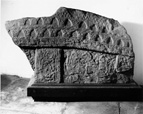C (long): The ridge decoration is identical to that on A, but more of the upper border survives on this side. Almost all traces of the end-beast have disappeared. The upper row of type 9 tegulation, some of the second row, and the cabled moulding separating them, still remain; the shingles are decorated with triquetra ornament, as on the other side. The rest of the roof ornament has now been worn away, and all that survives on the side is a fragment of interlace of complete turned A executed in median-incised strands.