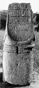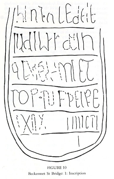 The long inscription, occupying what on other Cumbrian shafts seems to be the 'public' face, is in the form of lettering not found anywhere else in Cumbria. Okasha finds the text illegible and chillingly notes that 'In 1816 Lysons and Lysons described the text as "in too decayed a state to afford any satisfactory conjecture as to its import". Nevertheless, since then five translations from three different languages have been suggested' (Okasha 1971, 52). She does not include any of the letter forms in her tables of non-runic scripts, but in the variety of the letter forms she records (Okasha 1964–8, 322–30) there appears to be some similarity with the inscriptions from Whitby (Peers and Radford 1943, pls. XXII–XXV) and Dewsbury (Collingwood 1927a, fig. 73), Yorkshire, and with the memorial stone from Falstone, Northumberland (Cramp 1984, 172–3, pl. 166, 889–91). The letters are seriffed and are apparently Insular majuscules with the words well spaced. Falstone and Dewsbury provide parallels for many of the letter forms but the distinctive 'A' is not found in those inscriptions whilst it does occur at Whitby. The form of 'D' used is most closely paralleled at Dewsbury and perhaps we should see again a link between Cumbria and western Deira here.