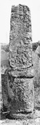 Round-shaft derivative, type g, with collar, type h. The single panels on all four faces of the rectangular part of the cross are bordered laterally by a roll moulding and each panel has a swag moulding at the bottom. The collar appears to be formed by three encircling mouldings, in which the outer ones are cabled. The socket is round and the base is plain.