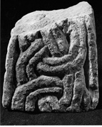 A (broad): Interlace, probably free rings crossed by long diagonals, with median-incised strands.