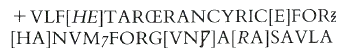 The inscription opens with a cross. Some letters have distinct serifs. Most are slightly clumsy versions of Roman capitals. A has a bar across the top and no cross-bar. C, G, and O are round, and E is square. N is of the form in which the diagonal touches the verticals short of the ends. Both open and closed R are used. S is angular. Wynn is used in the second name. The Tironian sign for and or ond appears. There are no punctuation marks or word-dividing points.