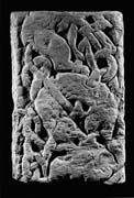 A (broad): At each side is a cabled edge moulding. It contains a single panel which has substantial parts of two animals of a beast-chain, loosely disposed. The lower one adopts an S-formation, its rump against the right-hand edge moulding, its chest against the left-hand one. The head hangs down over the back. The body has a narrow, contoured outline, which carries on round the semicircular nick where the fetter joins the throat. Within this double outline are four strips of pellets. The oval eye is also contoured. The snout of the beast's head is blunt and the jaws are apart. An ear extension rises from the brow, interlacing with the fetter and the body and limbs. The fore leg is hooked and the paw three-toed. Only the hind leg of the upper beast survives; it resembles a pig's, though the paw is three-toed. The hock is angular and the ham somewhat elongated. A faint trace of double edging remains on the belly. The ear extension from the beast below penetrates the rump through a semicircular nick. The infilling fetter bands are angular and even zig-zag. In the lower left-hand corner of the face the strand is median-incised and forms a loop which is not the free ring of Collingwood's drawing (1911a, fig. b on 258).