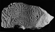No border mouldings survive. In the centre is a large free ring, intersected symmetrically by four other rings of equal size, whose arcs meet cross-wise in the centre. The spandrels are filled by triangles, each with a gouged out triangular centre. The segments of the four other rings beyond the area intersected by the central one were each apparently filled by a symmetrical acanthus-like spray. The one complete example has a pear-shaped, hollowed leaf in the centre, flanked by two broad crescentine 'leaves' which are in turn flanked by arched, hollowed, sub-triangular elements, each with a volute terminal.