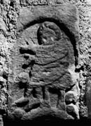 The fragment is edged with a flat-band moulding which expands into the undecorated, arched termination of the shaft. In the lower part of the panel the moulding erupts into nodding tendrils with simple volute heads. At the bottom are the remains of the broad, arched moulding of the lost panel beneath. Perched on the arch is a two-legged stool with bulbous feet and a 'Byzantine cushion'. On the seat is a profile human figure, his legs dangling and his pointed toes filling the corner by the tendrils. A kirtle is caught round the knees, but any signs of drapery folds have disappeared. The shoulder is humped and both hands extend in front of the figure to the left, with thumbs raised. The lower edge of the left arm is still pronounced as it is cut in a step; the right arm is much shorter and the hand appears to stem from the shoulder. The head is in half-profile with incised eyes and drilled mouth. The hair clings closely to the head in a raised moulding along the crown and the right side.
