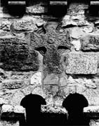 A (broad): The complete cross-head is a plate head (G.I., fig. 3, 5) the arms being type E10, splayed with wide arm-pits and convex ends. The plate is recessed and has a double plain moulding, giving the appearance of a median-incised type 1(a) ring. A similar (though single) moulding runs round the perimeter of the cross-head and -shaft with no separation between the two elements. There is a central domed boss with a depression in the middle. The upper arm of the cross is very worn but there seem to be parts of a bird form bound by a trailing band. In the right-hand arm is a wing-shape. The birds, if such they be, appear to be looking back. The rest of the decoration in the lateral arms is probably loose interlace which is connected with that of the lower arm and shaft. The lower arm has a knot executed in broad strands which is broken at one side. On the shaft are, apparently, two human figures placed across each other in a saltire fashion: the legs are comparatively clear, as are the elbow and head of one figure and the shoulders of the other; the rest is obscure. Below them are two small profile human busts with domed heads. There are slender vertical shafts in front of each. The cutting on the shaft is more shallow than on the cross-head.
