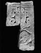 A (broad): A flat edge moulding continues across the top of the panel. At the right, at the base of the fragment, is a full face head with incised eyes and nose in a single line and a pointed hat or helm. The area alongside this figure is lost. Above, occupying the whole width, is a crude human figure with legs astride and elbows raised in a crab-like manner. The eyes are drilled and the nipples are incised circles. At each side is a broken angular frame.