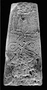 A (broad): The lower part of the face is damaged. In the centre of the panel is an open pair of unpinned loops, the strand rising at the top to meet a rough transverse plain moulding. On this stands the lower half of a human figure, the feet turned to the left; remains of a kirtle and belt are obscured by damage. On the left is a vertical sword with straight guard and trilobed pommel. All the cutting is with the punch, and clumsy. The loop intrudes upon the edge moulding at one point.