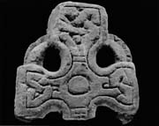 B (narrow): The end of the lateral arm has a flat perimeter moulding containing a triquetra with a flattened upper loop using a median-incised strand. The top of the wheel's crest is very worn but seems to have had flanking flat mouldings containing a simple twist.