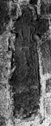 A (broad): The perimeter has a broad plain edge moulding. The principal face and cross-head is occupied by a Crucifixion. Christ's head is disfigured in the upper arm but a dished halo is discernible as well as a forked beard. His hands extend into the lateral arms passing over a vertical bar beneath the palms. There is a small pellet by the thumb and another in the corner. Below his left hand is a meandering filler. Christ wears a short tunic with two incised circles on its front. He is bound by a bold transverse bar with a contoured outline. At one end the bar is accompanied by pellet fillers. Within the right-hand moulding is a tapering band with a point below the arm-pit and a circular terminal. On the left-hand side is a possible broken spear point. Below the bar is the skirt of the kirtle and Christ's legs, straight and together with the feet splayed. Beneath the feet are two addorsed S-shaped serpents, very worn. A broad transverse moulding terminates the panel and some inches below it is a roughly incised horizontal line.