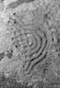The fragment is sub-rectangular and is decorated with an incomplete quatrefoil composed of two groups of four concentric ovals crossing at right angles, and interlacing where they cross.