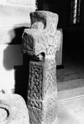 A (broad) : The cross is a plate-head (type 5) with type 10 arms, the upper limb with a curved tip. There is a broad, rough perimeter moulding. Each arm contains a 'Brompton loop' linked to the adjacent one. In the centre is a rectangular element containing an incised rectangle with a saltire. All the work is picked. There are possible traces of red pigment on the surface. The neck of the shaft is marked by a plain transverse moulding. Below is a panel of closely woven six-cord plain plait in a closed circuit of five stages. The broad edge moulding is roughly carved. The lower part of the decoration is terminated in a vandyke, damaged at its tip, within a plain moulding but with no internal divisions. It contains three interlace patterns of closed circuit, the lowest one damaged at the base: the upper part of the two surviving knots resembles the 'Brompton loop', but with a bar terminal below.