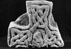 D (narrow) : Within a plain perimeter frame the arm-tip has closed circuit pattern B interlace of four stages. The hole-points are gridded at 1.5 inch distances. The top of the plate-head disc may have had interlace; it is now very worn.