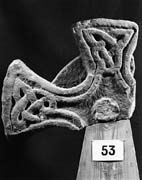 One cannot be certain that face E was indeed the upper limb. The present disposition of the fragment might be turned through 90 degrees, giving a longer upper limb. This cross, very like Northallerton 9 (Ills. 685–6), demonstrates the variety of ring and plate heads within the Brompton school. There is less horror vacui in the interlace design, with clear ground above the boss. It is an Anglian cross-form with the addition of a Brompton plate.