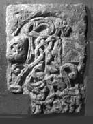 The design, which has been cut into a rectangular slab, is outlined by a segmental arch at the top, then narrows between two projections and expands again into what seems to be a rectangle within broad borders. The effect is to give the main field of ornament a cruciform shape with a rounded upper arm and rectangular side arms. The projection on the left, 3 cm deep, is carved with an encircled interlace motif or ring knot; that on the right is in lower relief and is not carved save for two diagonal incised lines. The main field is filled with a tangled plant-scroll with median-incised stems. The arched head contains a large curling leaf with incised triangular centre, and a smaller leaf-flower with scooped heart-shaped leaves or petals and a central bud. Their stalks then cross and sprout heavy tendrils which are clasped by rectangular clips. Looping through their strands are a pair of long half-moon leaves (Cramp 1991, fig. 11) and towards the base are other leaf-flowers with buds, their surfaces very worn.