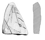 The stone is a roughly triangular shape with a flattened tip, and is decorated on only one face. This is the flattest face and on it have been incised three lines which radiate from the tip in a triangular formation with a fainter horizontal line which forms an angle at the base. There are futher shallow scratches within the vertical lines and deeper slashes radiating from the right of the vertical incisions. At the left base of the stone a deeper groove cuts at an angle across the vertical line and within the triangle so formed is a neat circular motif.