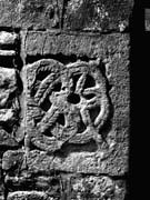A: There are wide flat-band mouldings on three sides, which have been rubbed down since they are on a lower plane than the carving they enclose. A slightly scalloped effect in the top right could have been a row of pellets. The interior space is filled with a composition of two ribbon animals whose bodies loop and cross, and taper into incised tails which loop at the top. The body of one beast is ribbed with a herringbone pattern and incised central groove, and the other has incised zig-zags (width of bodies c. 5 cm).