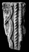 A (broad): Only one carved face survives. On the left two median-incised strands cross over and under, one of them swelling into an animal head with a pointed ear and almond-shaped eye. To the right two separated bands of opposed cable, and beyond that the piece is broken. Traces of burning on the stone.