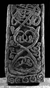 C (broad): This side is much more worn than any other face, and also appears to have been heavily whitewashed, which makes it difficult to interpret. There are space-filling independent curls emerging from the lower side borders. The lowest horizontal form within the panel is similar to the root of the scroll on face A, but is partly double-outlined and the crossed strands terminate in long curls below, which Collingwood (1915a, 136, fig. d) drew as if the framing curls of a head: the feature framed by these curls is very unclear now but it might be a snake head looking up. The elements above which fill the main part of the shaft look like a freer and more stylised version of the scroll on face A, in which an illusion of a medallion scroll is created by a loose strand with curling or clubbed tips, which serves to link the two stems which rise from the 'root' and possibly terminate in a Stafford Knot-like form just below the top. The knot however has clubbed projections on its upper corners and there are indications of the pattern continuing above. The background surface is cut back and heavily pocked; the surface of the carving is flattened as on face A.