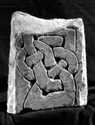 A (broad): The carving here appears to be a crude rendering of a single run of interlace with a bar terminal at top and bottom. Within these terminals is one register of simple pattern F in which the continuation of several strands is slightly offset, rendering the intention less intelligible. The space between the interlace knot and the upper terminal has been rendered as a disconnected strand, adding to the muddled appearance.