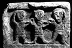 A (broad): Three frontal figures stand in a deeply recessed panel which takes up slightly more than half of the face. The panel has a damaged broad flat edge above and on the left: that on the right is damaged but possibly cut into by the arm of the right-hand figure. Each figure stands with his legs apart and feet turned outwards.