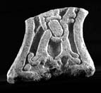 A (broad): Collingwood (1915a, 226) described this face as having a 'dragon plait' but it is not certain that the terminals of the strands represent either the heads or feet of animals. The two major strands which cross near the inner end of the fragment terminate at the outer edge in loose fronds, of which one (which crosses another) ends in a curling tip. The same strand appears to terminate in a similar form at the end. These two strands are caught up by a narrow lacing strand, one end of which terminates against the upper border, while the other continues towards the centre of the cross.