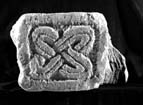 C (broad): A flat edge moulding frames the main surviving arm, enclosing a double-stranded interlace knot, a pattern F loop with the terminals distorted to fit into the corners. The diagonals are clearly extending into the adjacent arms.
