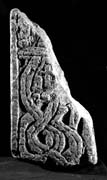 A (broad): Some more-or-less disconnected strands of irregular interlace survive, some with traces of being double-stranded or median-incised, and incorporating a loose curl near the upper right. It is not clear whether the strands belong to abstract or animal interlace.