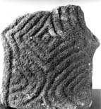 A (broad): The lower arm has three flat mouldings on both sides which follow the curve of the armpit. The inner two on each side return to form a double-outlined convex lozenge-shape, enclosing a single loose pellet at about the level of the widening of the arm. The outer mouldings curve back on themselves to form a rounded V-shape terminating against the side of the shaft below. This encloses further inner mouldings, following the same V-shape, two on the left and three on the right. The innermost moulding on each side encloses a loose pellet against the border. The shape formed at the centre of the base of the surviving piece suggests the start of a second lozenge.